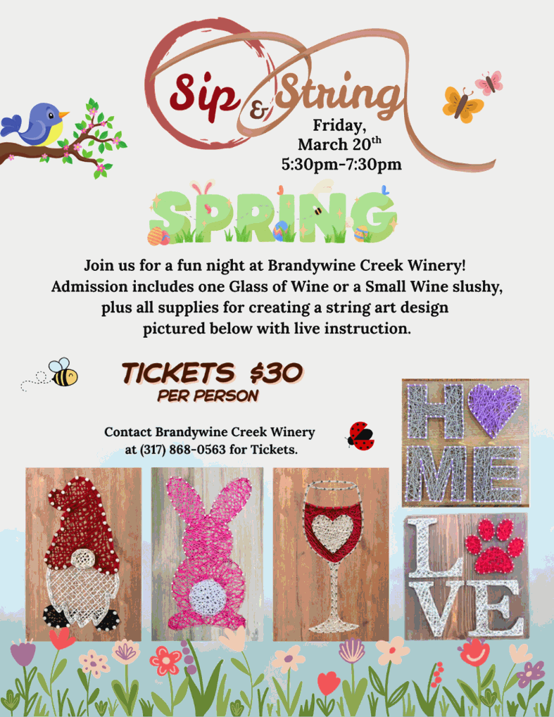 Includes glass of wine or small slushy & all supplies and live instruction for your choice of string art!