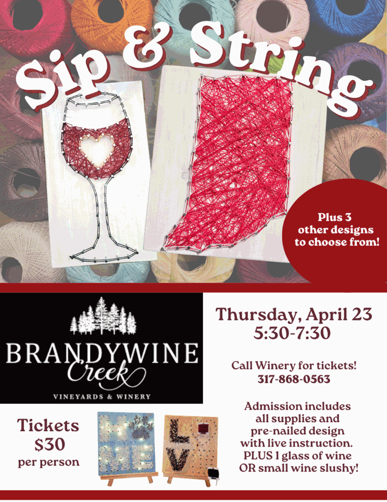 Includes glass of wine or small slushy & all supplies and live instruction for your choice of string art!